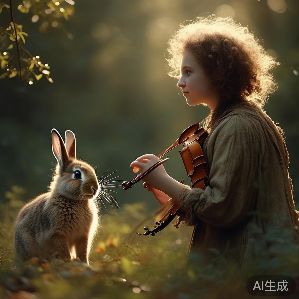 没多久,我又开始低声自语:“一个人总是太寂寞了,我得再找个伙伴。”掌控着音乐魔法的我再次扬起小提琴,琴音飘荡,吸引来了另一只动物。这次是一只野兔。“哎呀,是只可爱的野兔,”我微笑着说,“您真是优秀的听众,能教我吗?”