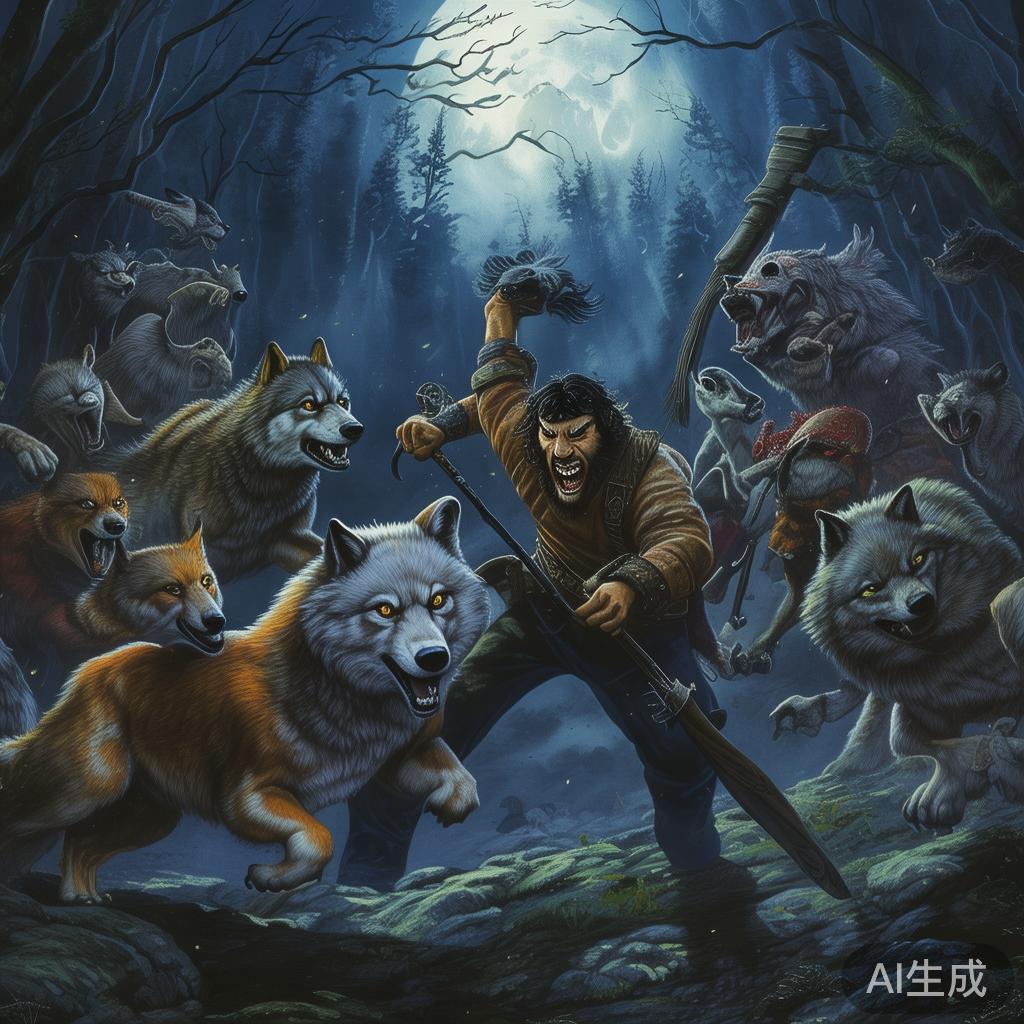 狼、狐狸和野兔显然也冲上前,但不同于刚才的轻松调剂,樵夫立刻注意到了这些生物的狂怒。他快速挡在我面前,拔起斧子,坚定地喊道:“有我在,谁敢伤害这位乐师?”